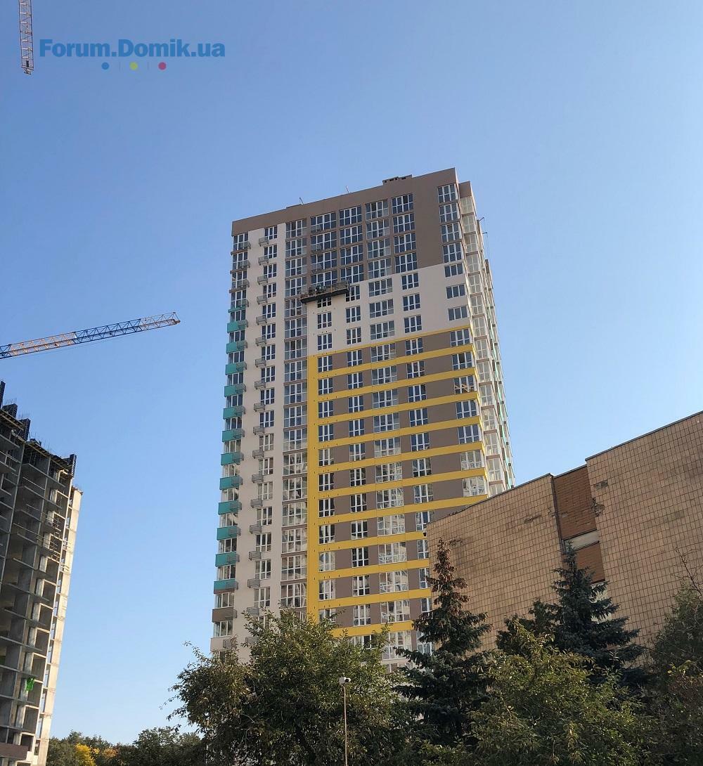 1 черга. Завершується установка вікон до 25 поверху включно. Проводяться роботи з утеплення будинку. Виконуються покрівельні роботи. Проводяться роботи з фарбування фасаду.
