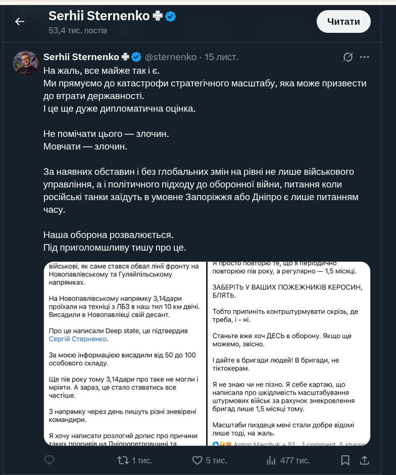 но где Стерненко и где форумний делулу писака, с потужной стратегией "территории в обмен на жизни орков", небось еще, где-то с Европки незламничающий лол