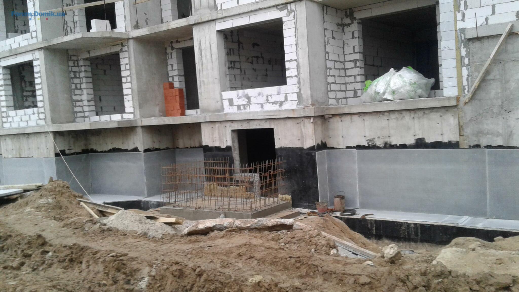 Благоустройство входной группы 2 и 3 секций. Гидроизоляция цокольного этажа 8 секции. Заливка входной группы цок.эт. 8 секции.Утепление фасада 2-3 секции.Штукатурные работы.
