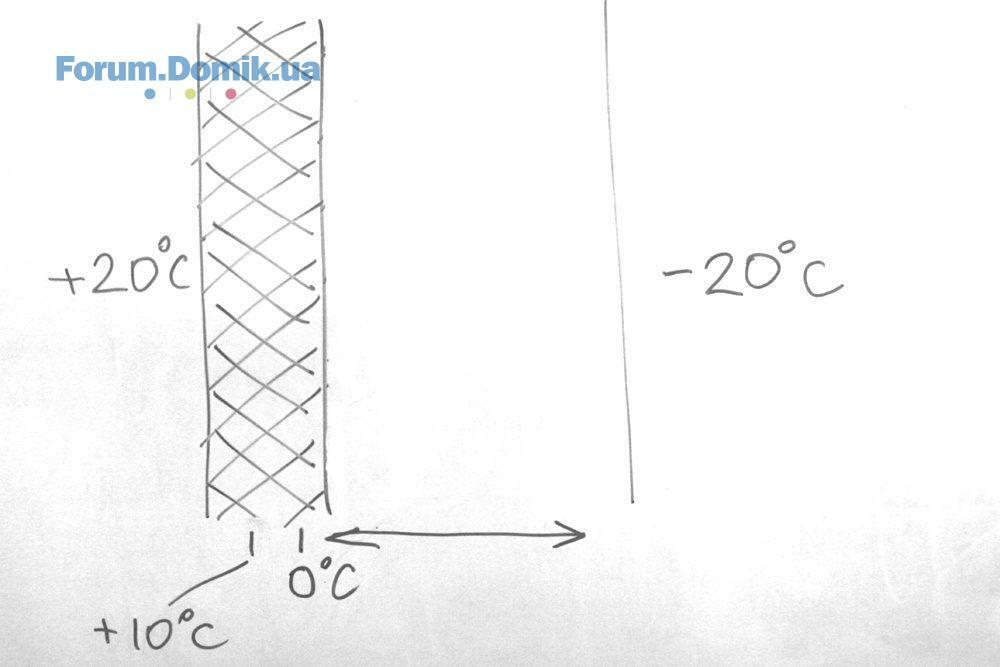 При утеплении стен с двух сторон точка росы попадает посередине при одинаковых утеплителях, как и в случае с неутепленной стеной. Но, в отличие от неутепленной стены, удаление влаги здесь затруднено, а размещение точки замерзания воды и точки росы внутри стены отрицательно сказывается на долговечности конструкций.