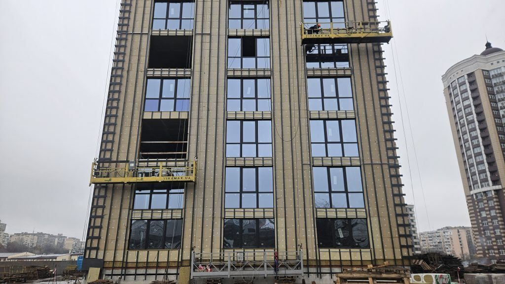 Реальний стан: Фасадні роботи та скління практично завершені. Тривають внутрішні оздоблювальні роботи та монтаж ліфтів.