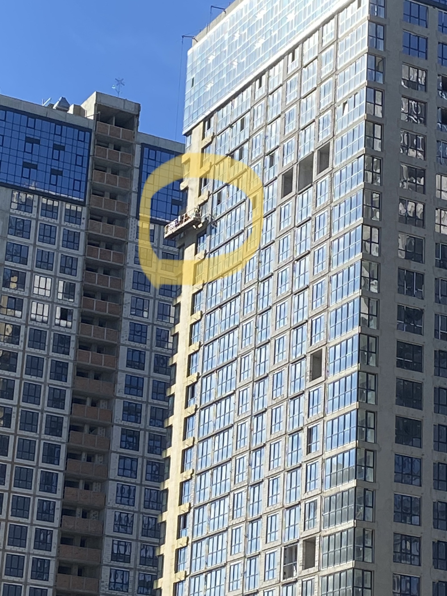 На третьому будинку працювала люлька. Утеплення. Але я бачу лише з цього ракурсу. Можливо, на інших боках будинків робіт проводиться більше