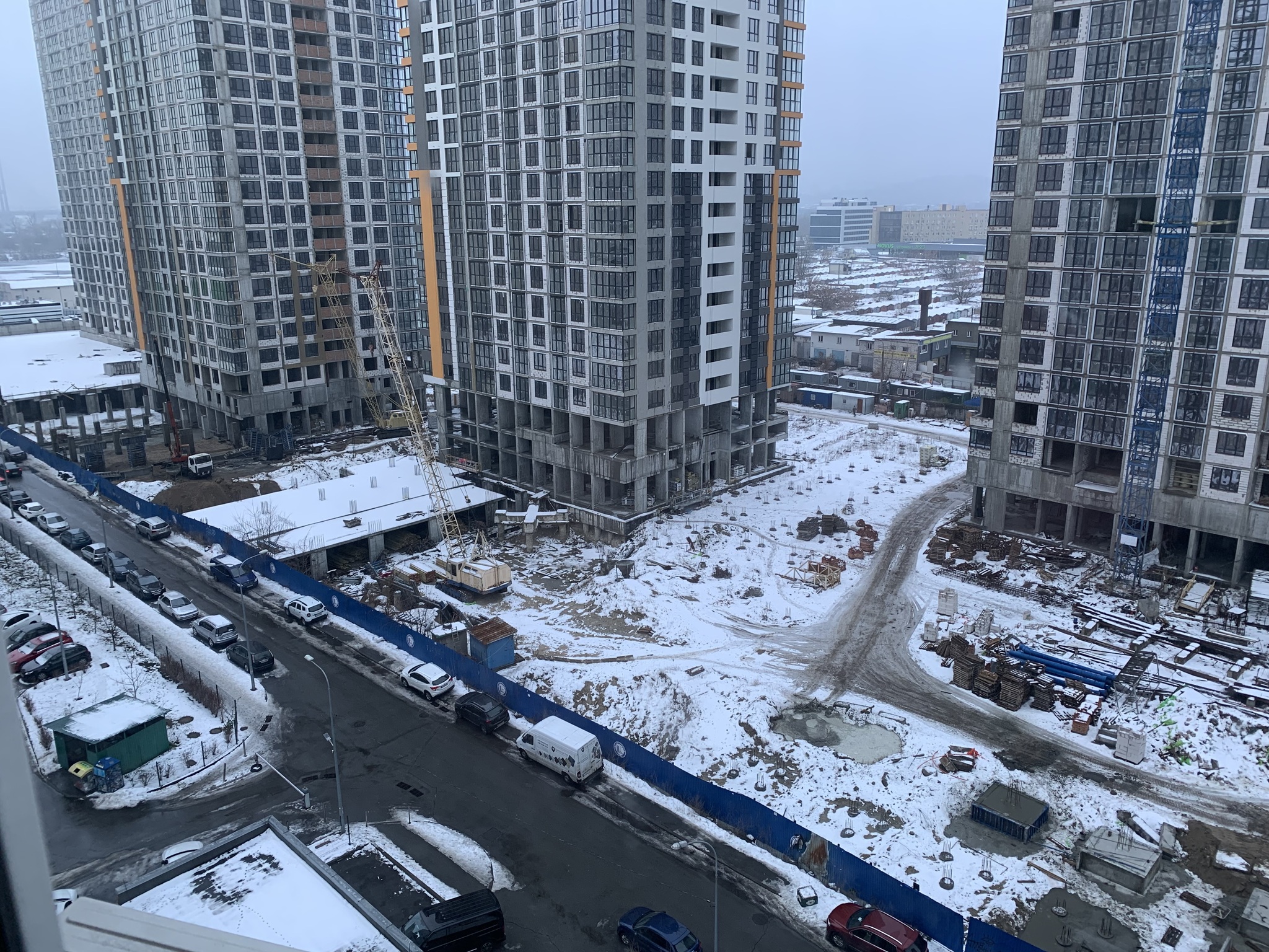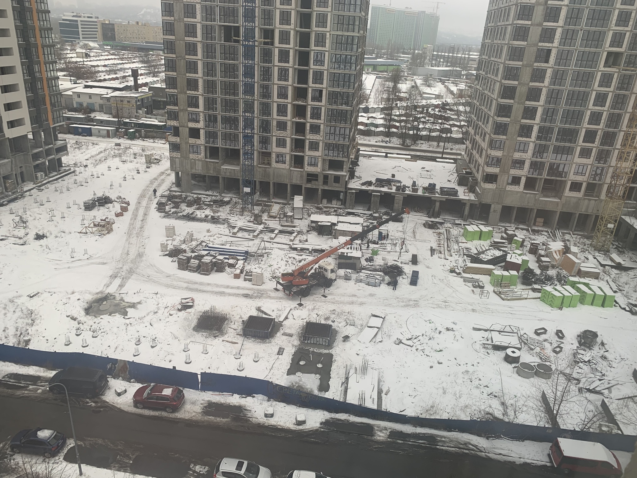 Бачу, що основні роботи йдуть на стилобаті між двома будинками. Час від часу приїжджає якийсь транспорт (крани, трактори, бетон привозять). Щось там страшенно гепає - щоразу сивієш ще більше, бо думка одна: прильот! Люди ходять. Отже, щось то вони будують. Не так щоб і завзято, але рух є.