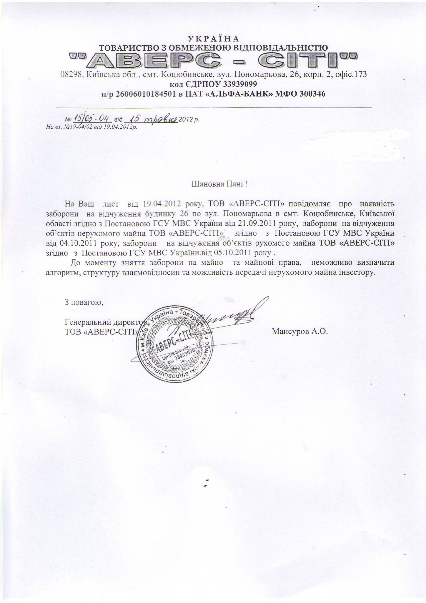 Добрый день.Поддерживаю что единственный путь у нас получить документы на право собственноси, лежит только через суд.Проводить митинги, а за ЧТО??? За то что бы сняли аресты с квартир инвесторов к которым нет притензий-СОГЛАСЕН, а если о снятиии с класных таких застройщиков как А/С то нет. То что 2009г.РБИ с А/С наламали дров в леце одного человека Лап..., с не законной передачей активов,от одной компании к другой и при этом поставили или (киданули) инвесторов и банк в не ловкое положение, все это сегодня выплывает на наружу. Этого рано или поздно стоило ожидать. На сегоднишний день невозможно дозвониться до АВЕРСОВ а именно юриста Анне Сергеевне, директора Мансурова А. отдел продаж вообще расспустили,стройка стоит- в этой ситуации я даже не знаю что можно и думать о застройщике. Вот что отписал мне А/С на мое письмо: