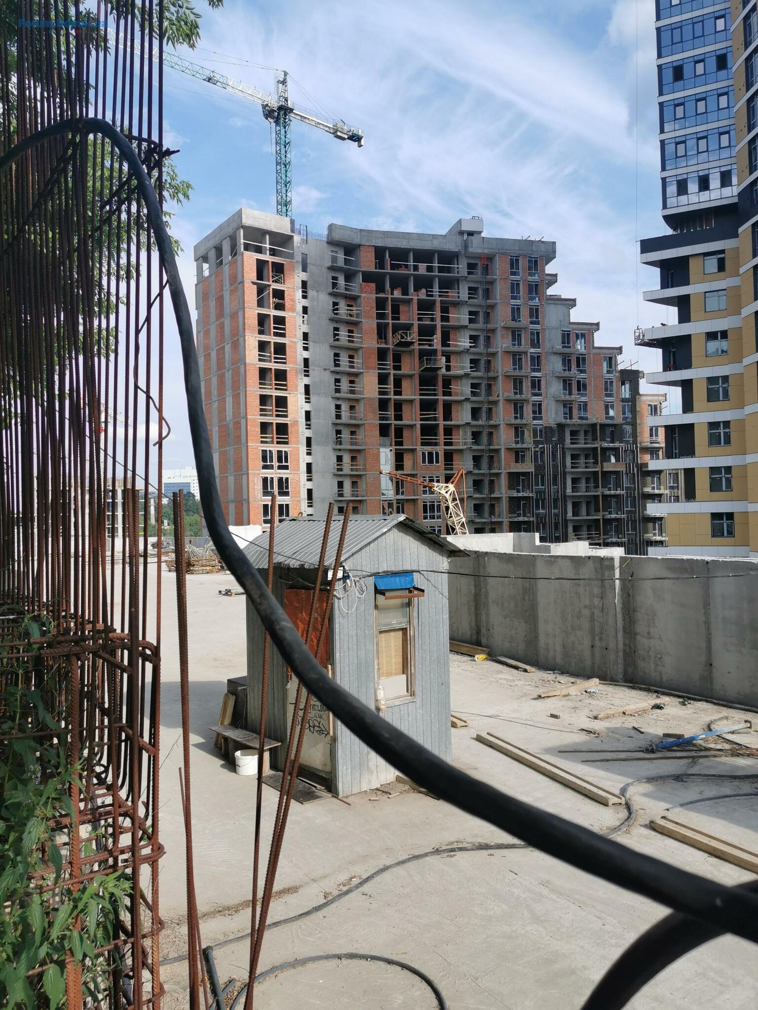 У буд. №3, секція А, виконують облаштування плити перекриття на 14-м поверхом. Облаштовують цегляну кладку стін - 10, 11, 12 поверхи.