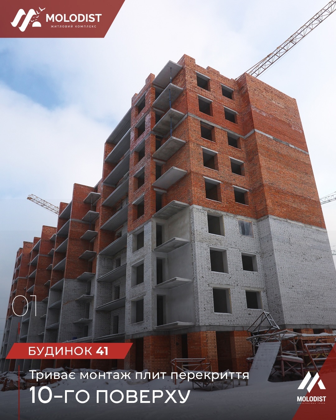 - Будинок 41 — завершено цегляну кладку стін 4-го поверху. Триває влаштування монолітного армопоясу.